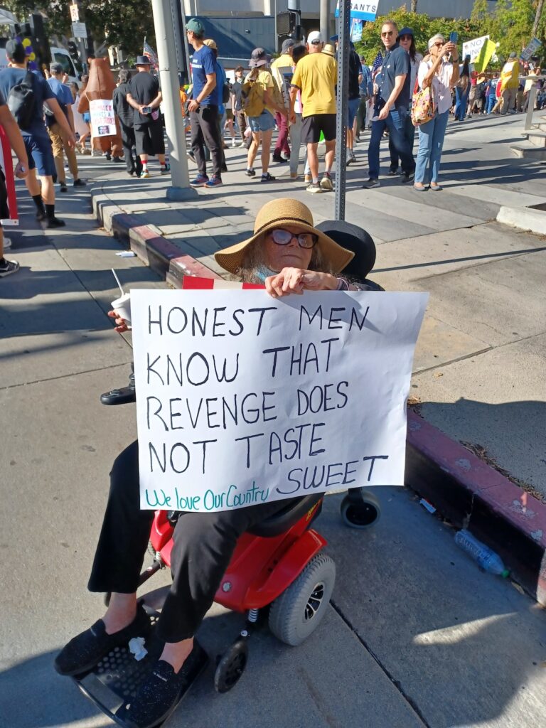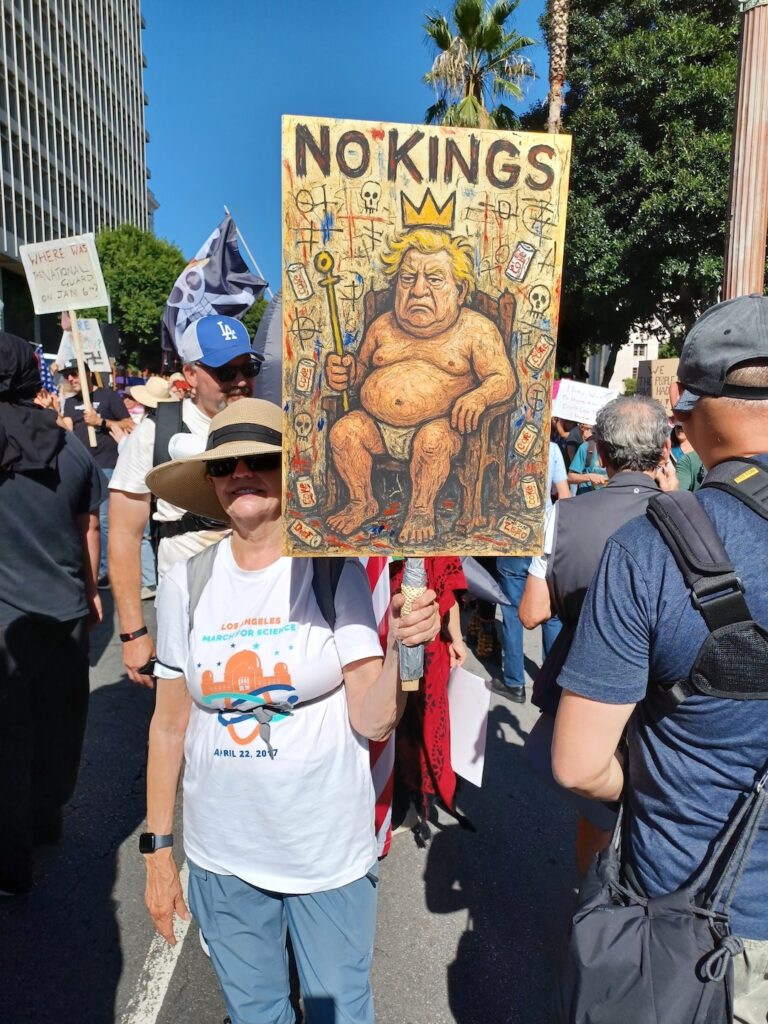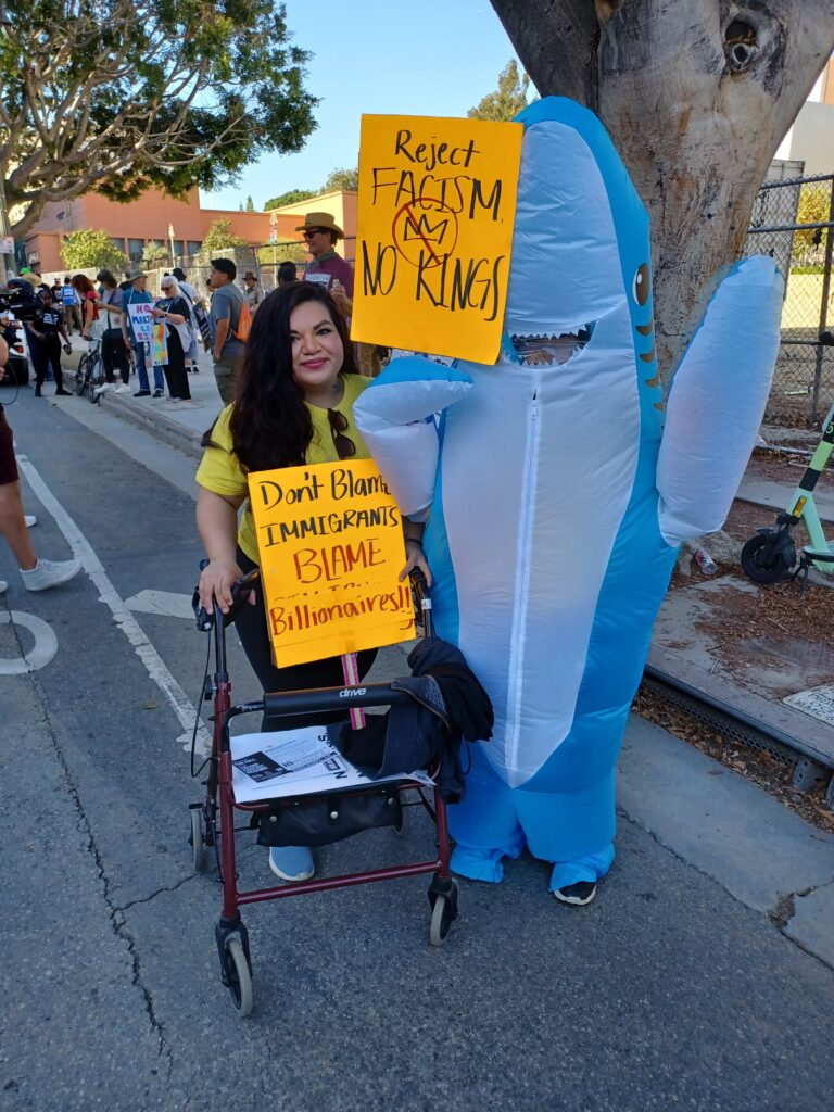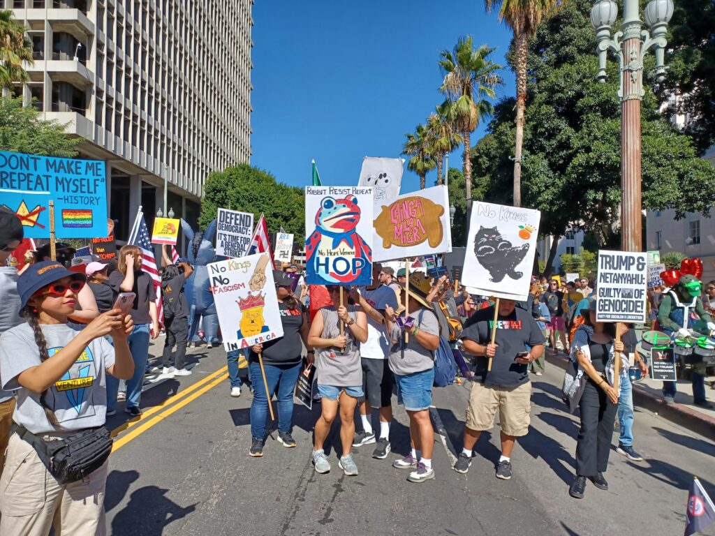 Aunque la cita original era a las 2:00p.m., los estadounidenses empezaron a llegar al parque Grand desde el mediodía del pasado sábado 18 de Octubre, muchos de ellos portaban pancartas donde se leía frases en inglés como “ICE Out LA” (ICE fuera de Los Ángeles), “No Kings”, “Trump Must Go Now!”, “Together We Can Stop Deportations!”, “Where are the Epstein Files?”, “Abolish ICE & Bring Our Neighbors Home!” y “Defend Our Democracy”, entre otras leyendas.