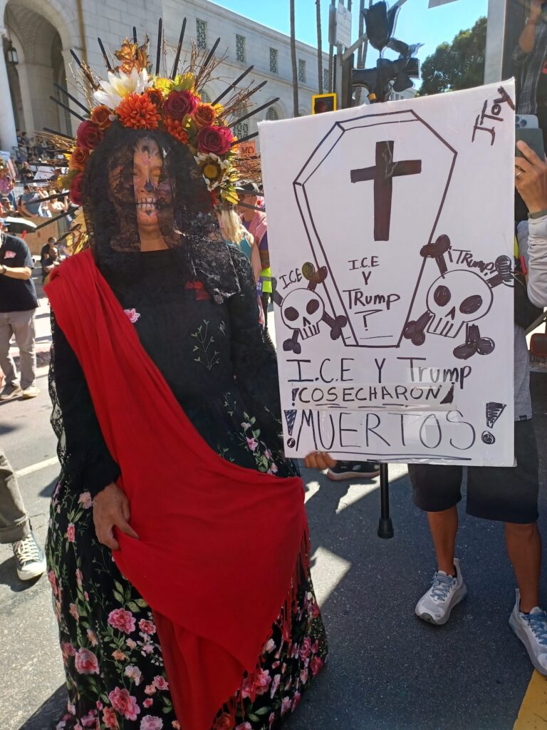 En la manifestación y frente a la alcaldía de Los Ángeles en las calles Spring y Temple, se encontraba una mujer vestida de Catrina (personaje típico de la cultura mexicana) que se identificó como Ana y dijo que decidió participar en la marcha de esa manera, para protestar por las muertes que ICE ha provocado este año con las redadas.