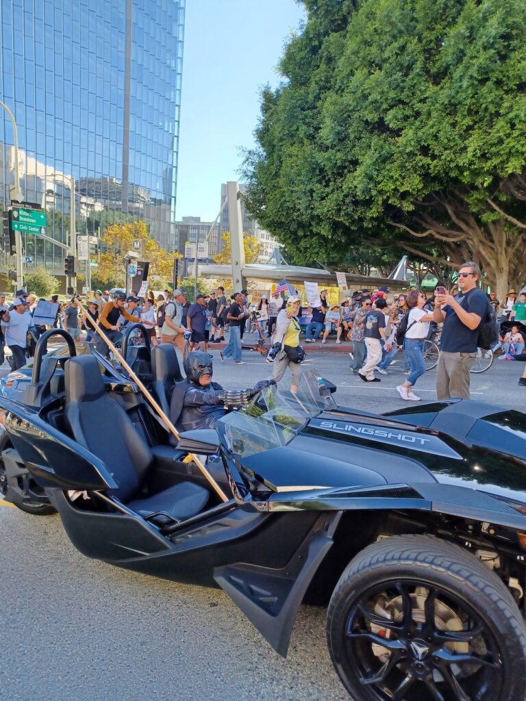 Otras personas decidieron disfrazarse de rana, que han surgido como un símbolo de resistencia en Portland, Oregón, pero otro personaje que logró destacar en la manifestación fue un hombre vestido de Batman a bordo de su batimóvil negro (en alusión a que va a luchar por la justicia y la democracia del país), así como un globo enorme del presidente Donald Trump con un pañal.