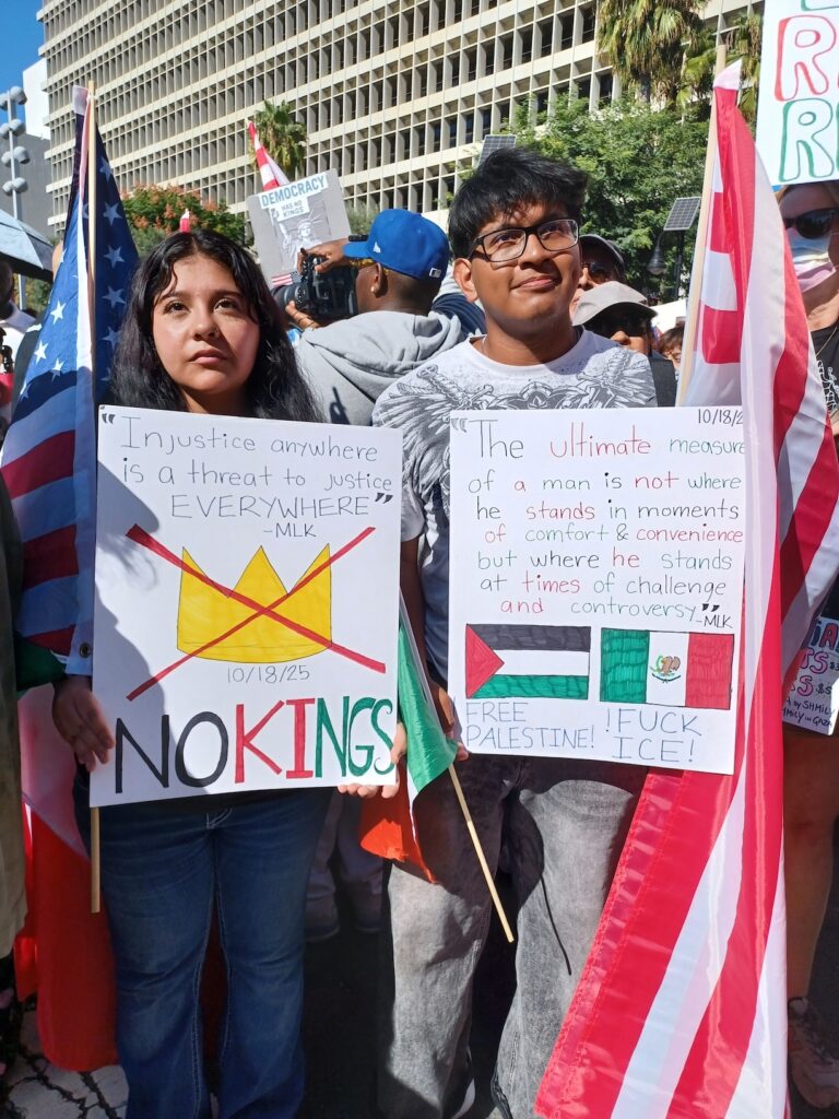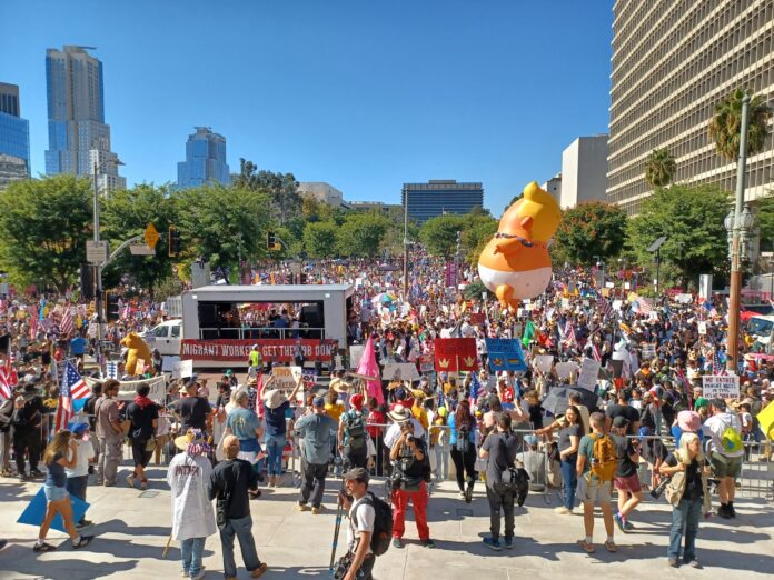 Los Ángeles, Ca.- Una ola humana cubrió las calles aledañas al edificio de la alcaldía de Los Ángeles y el parque Grand Gloria Molina en la segunda protesta de un Día Sin Reyes (“No Kings”, en inglés) para levantar su voz en una sola para exigir que ICE (Servicio de Control de Inmigración y Aduanas) se salga de sus comunidades, salarios dignos y justos, acceso al cuidado de la salud y a la vivienda y respeto a la Constitución de Estados Unidos y a la democracia, uniéndose esta manifestación multitudinaria a las otras que se realizaron en más de 2 mil 500 ciudades de toda la nación para dejar claras sus demandas a la actual administración del presidente Donald Trump y su rechazo a sus políticas.